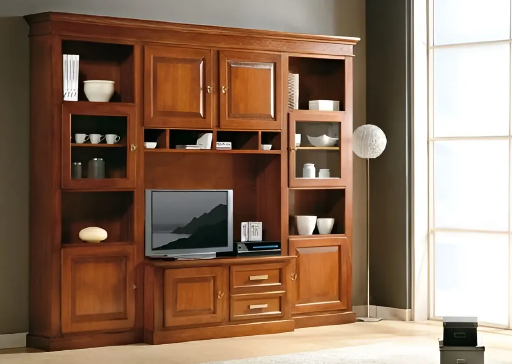 Parete attrezzata finitura noce classico con ante, cassetti e vani a giorno. Misure parete in cm.: L. 280 x H. 230 x P. 50 – Misure del vano a giorno porta TV in cm: L. 124 x H. 78 x P.50. É possibile per questa parete attrezzata avere anche altre finiture di colori.