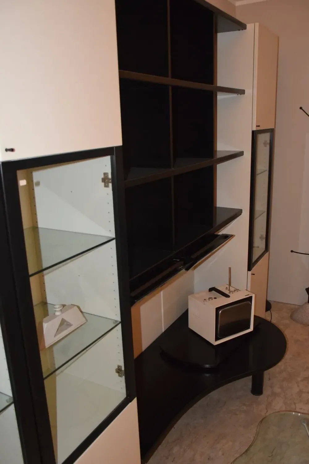 Completa di zona tv sagomata con mensole a giorno e cassettini.