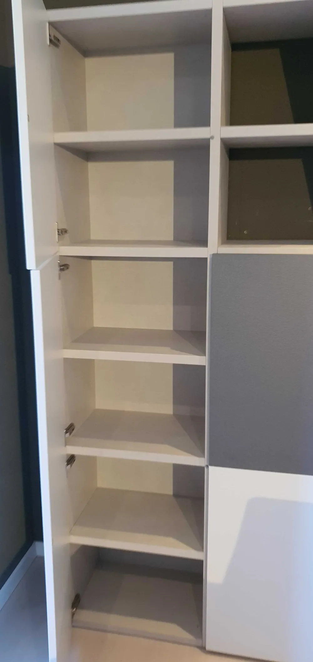 I materiali utilizzati vanno dal materico Cemento chiaro al materico Paglia grigia con alcune ante in materico bianco gesso opaco. I tre cassettoni presenti a terra sono equipaggiati di guide a scomparsa mentre le antine montano cerniere e bracci di ultima generazione. La caratteristica dei pensili con taglio diagonale rende unica questa composizione che offre molta capienza senza rinunciare all’estetica. Questa parete attrezzata può essere utilizzata per contenere libri ma al contempo può essere utilizzata per contenere stoviglie ed oggettistica di altro genere grazie ai vani chiusi.