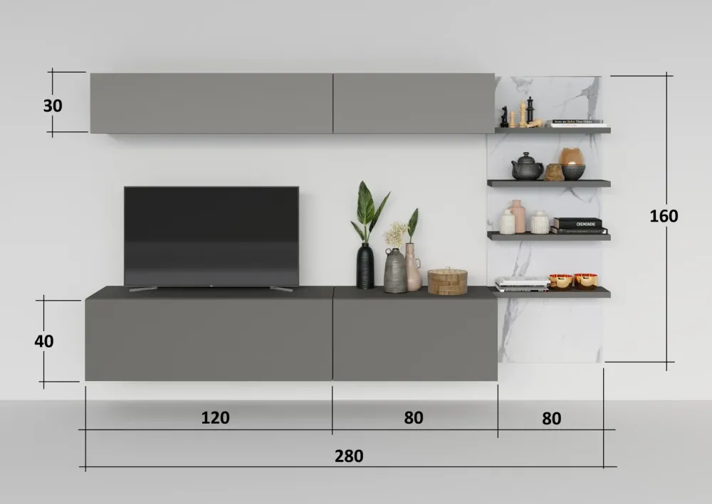 - La larghezza della composizione qui presente, che va da 251 a 300 cm, è tale da rendere questo modello adatto ad essere inserito in locali di varie misure.