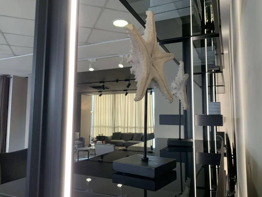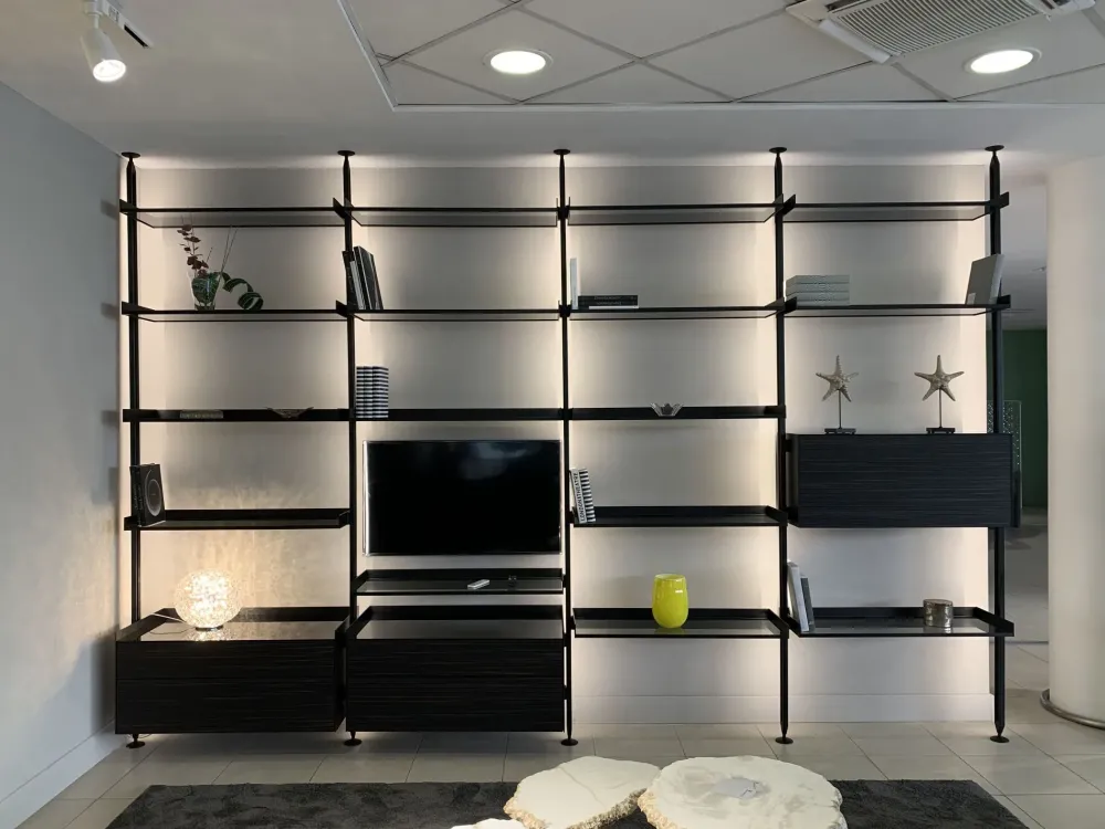 Parete composta da: Montanti a soffitto retroilluminati alluminio fin. 13 Nero (con telecomando ) 1 Contenitore a ribalta fin. 700 Tinto Ebano Taiga , interno in similpelle 153 Castoro e top in vetro nero. 2 Contenitori con cassetti fin.700 Tinto Ebano Taiga e top in vetro nero. 16 ripiani con struttura fin. 13 Nero e piano in vetro 63 Grigio