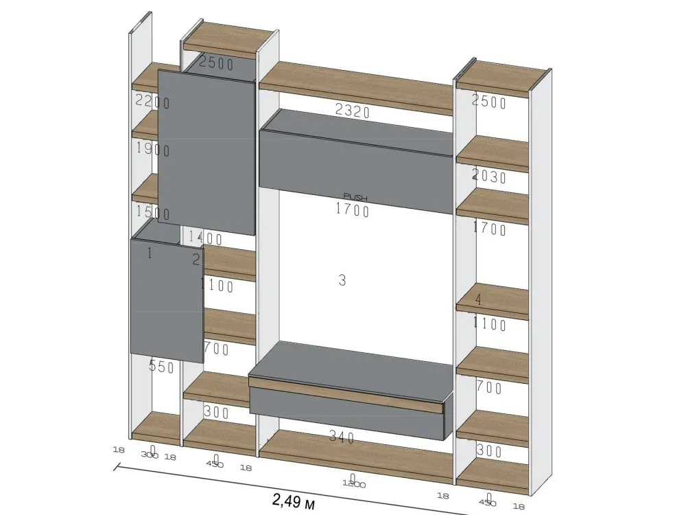 Parete attrezzata / libreria con vano porta TV L. tot. 250 cm, profondità 34 cm, H. 256 cm. Fianchi e tramezzi verticali colore bianco opaco sp. 18 mm; ripiani color rovere chiaro sp. 38 mm; con 2 moduli ad anta color grigio seta; 1 modulo pensile con apertura basculante con top col. grigio seta, Profondità 53 cm. Possibilità di abbinare tavolo, sedie e madia con stessa finitura e colore. Possibilità di variare composizione in dimensioni e finiture con consulenza e progettazione personalizzata gratuita.