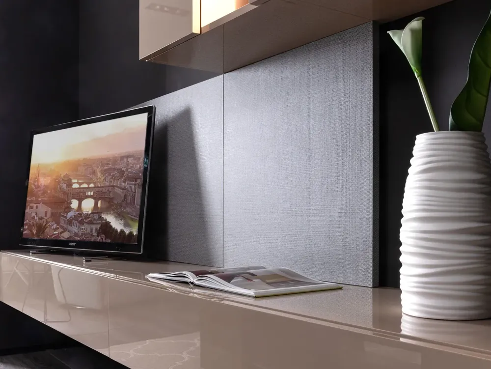 Per quanto riguarda le finiture, la parete Plan 27 outlet combina il laccato lucido Nude con il nobilitato Gurè, creando un bellissimo effetto tramato che dà un tocco di eleganza e modernità.