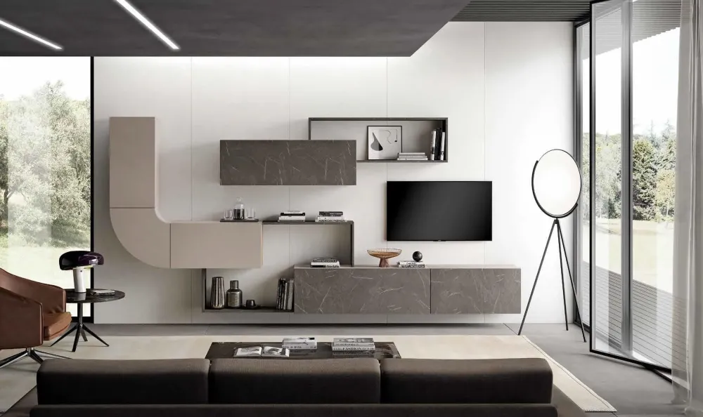 La proposta per il living qui disponibile è realizzata in materiali durevoli e resistenti nel tempo: questo modello, in particolare, è in laminato materico.