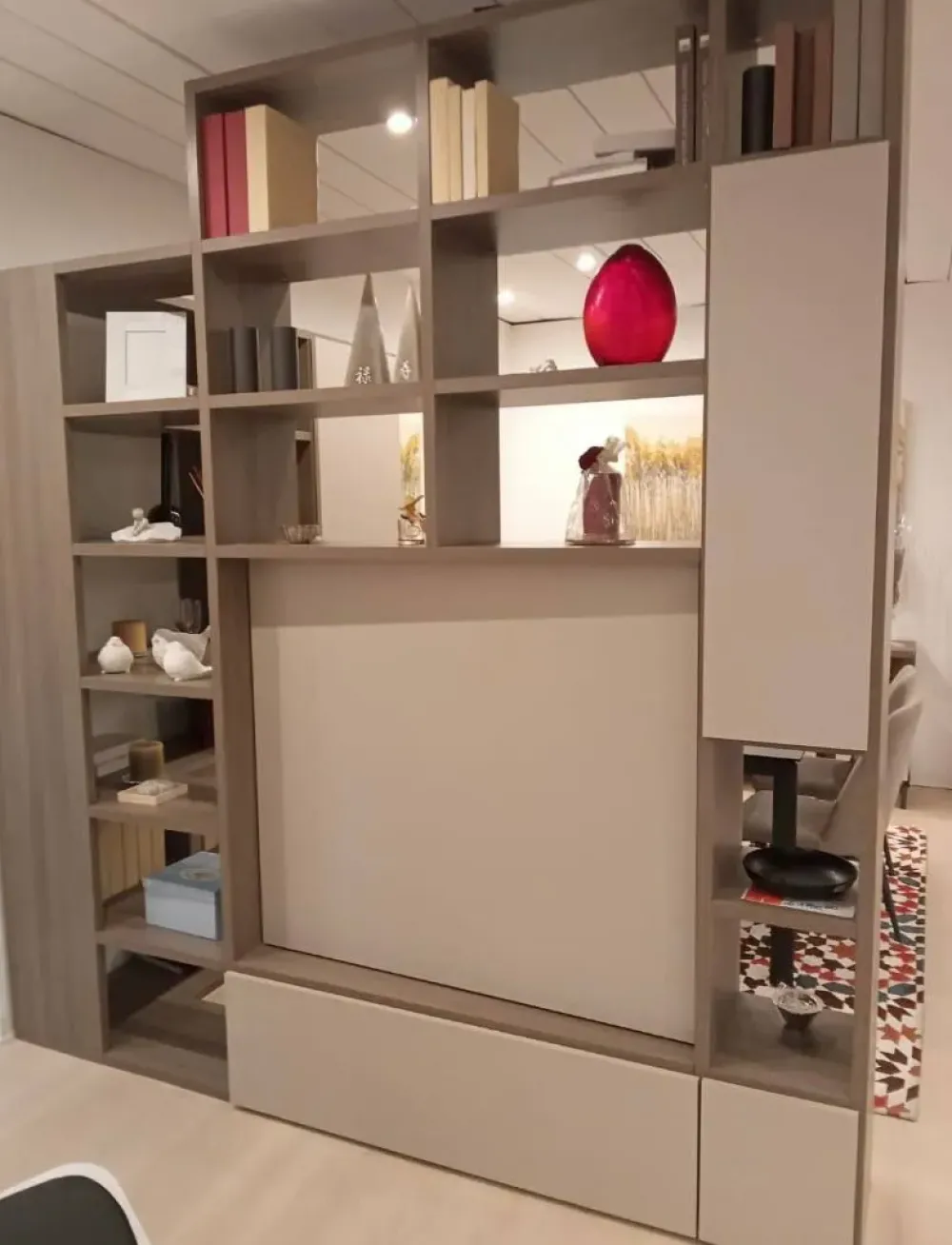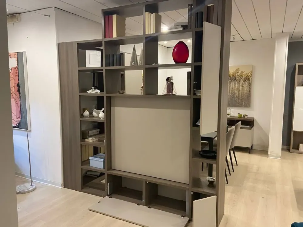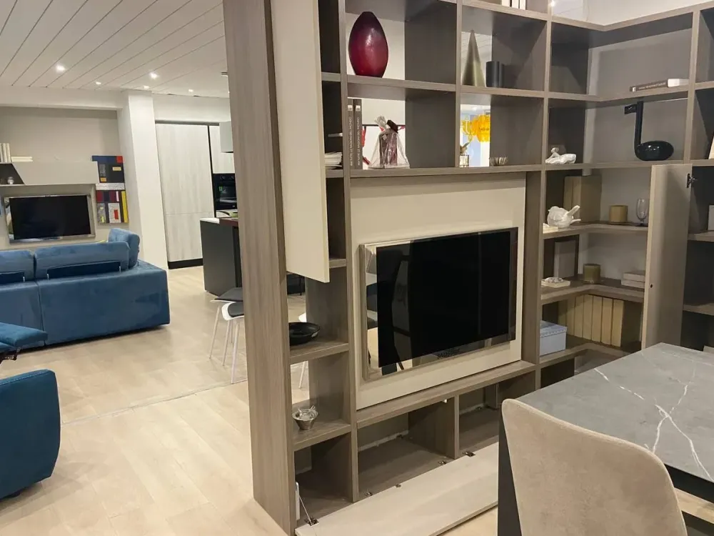Parete attrezzata divisoria con elemento porta tv girevole a 360°.