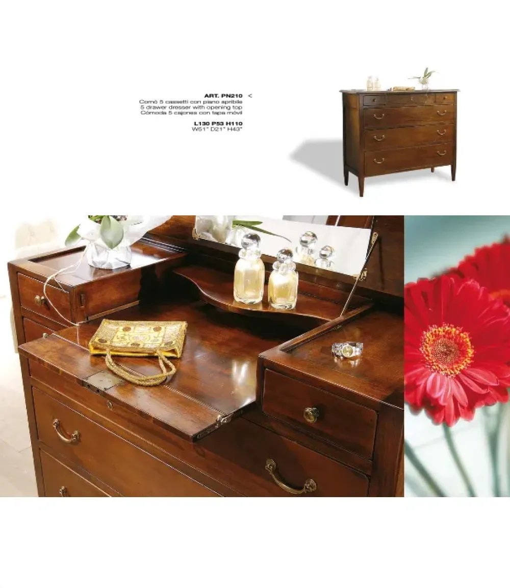 Comò in noce nazionale 5 cassetti con piano apribile