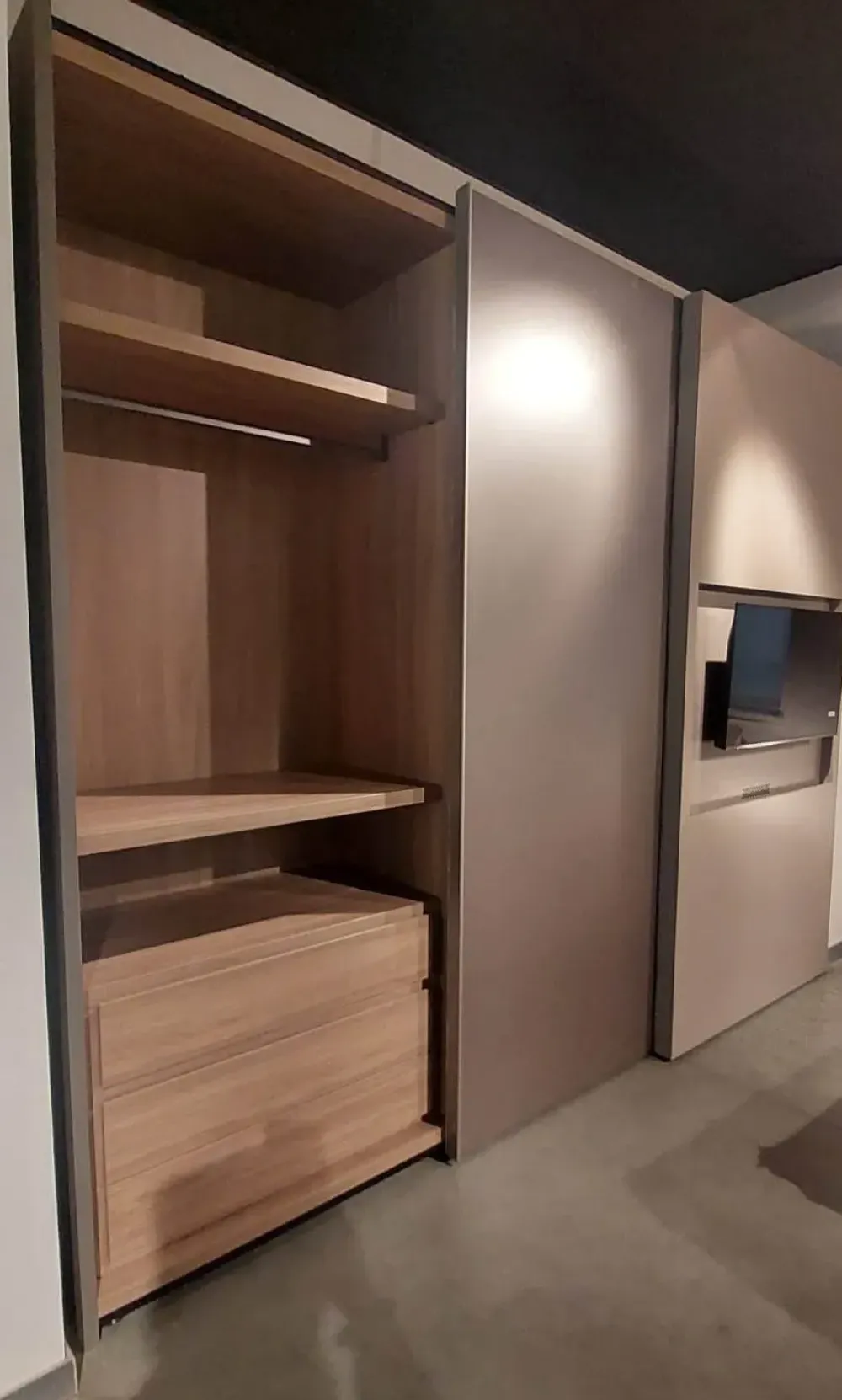 Armadio Pianca composto da tre ante scorrevoli di cui una con porta tv, finiture materico vinile e laccato opaco ecru, completo di cassettiera, ripiani e luce led porta (L325 x H258).