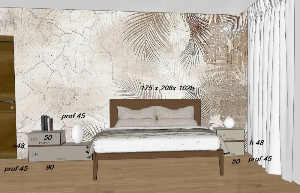 1 comodino composto da modulo a cassetto a terra cm 90 x45xh25, e modulo a cassetto comodino in appoggio cm 50x45porfxh2o e separati da distanziale estetico per richiamare il legno del letto