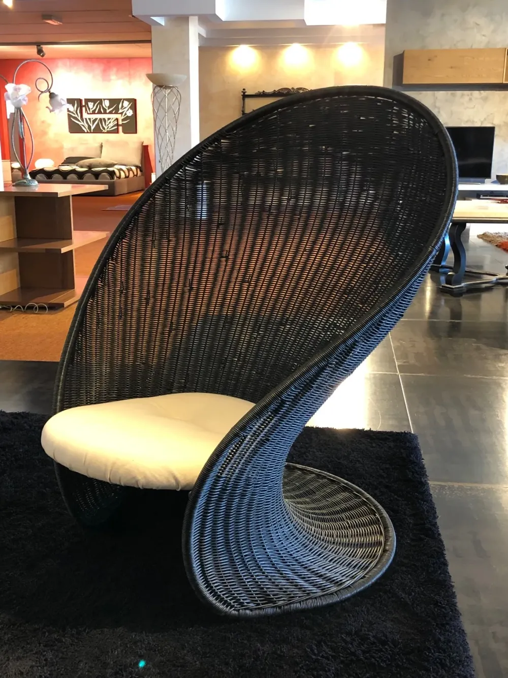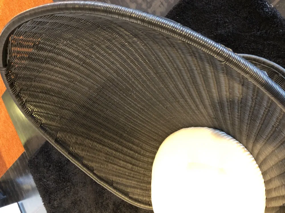 Realizzata in RATTAN MIDOLLINO Tinto nero . Forma ispirata a una Foglia dalla quale ha preso il nome.