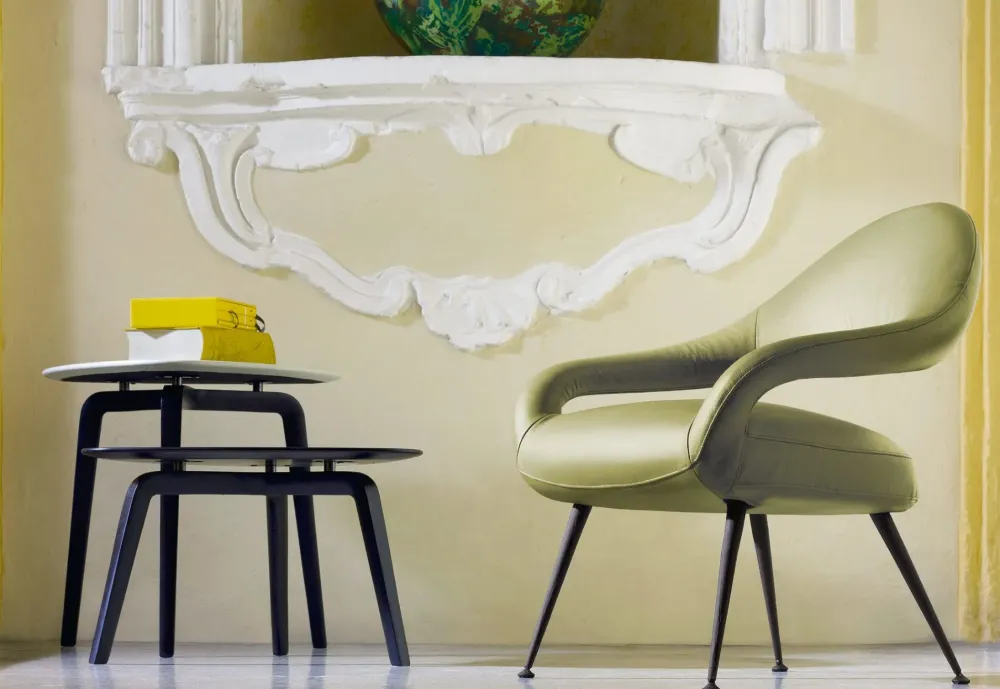 Eleganza, stile, atmosfera anni 50: la poltrona Letizia riassume in sé i fermenti creativi di un epoca. Un icona di stile che attraverso il tempo mantiene intatta la forza di un intuizione felice. Disegnata nel 1954 da Gastone Rinaldi con il nome di DU55P, Letizia è oggi rieditata da Poltrona Frau. Con le sue linee sensuali e morbide e il gioco dei vuoti e dei pieni, Letizia si inserisce con grazia in ogni ambiente, regalando un tocco di sofisticata leggerezza
