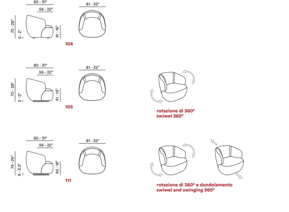 Ember è disponibile nella versione fissa, girevole con basamento swivel e girevole con l’esclusivo e rilassante movimento a dondolo.