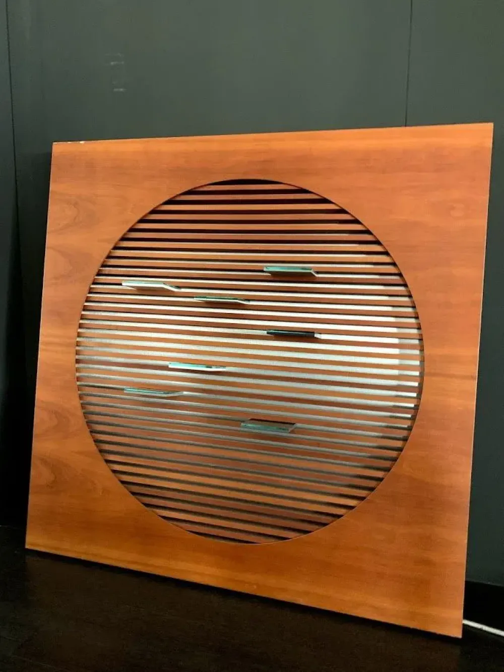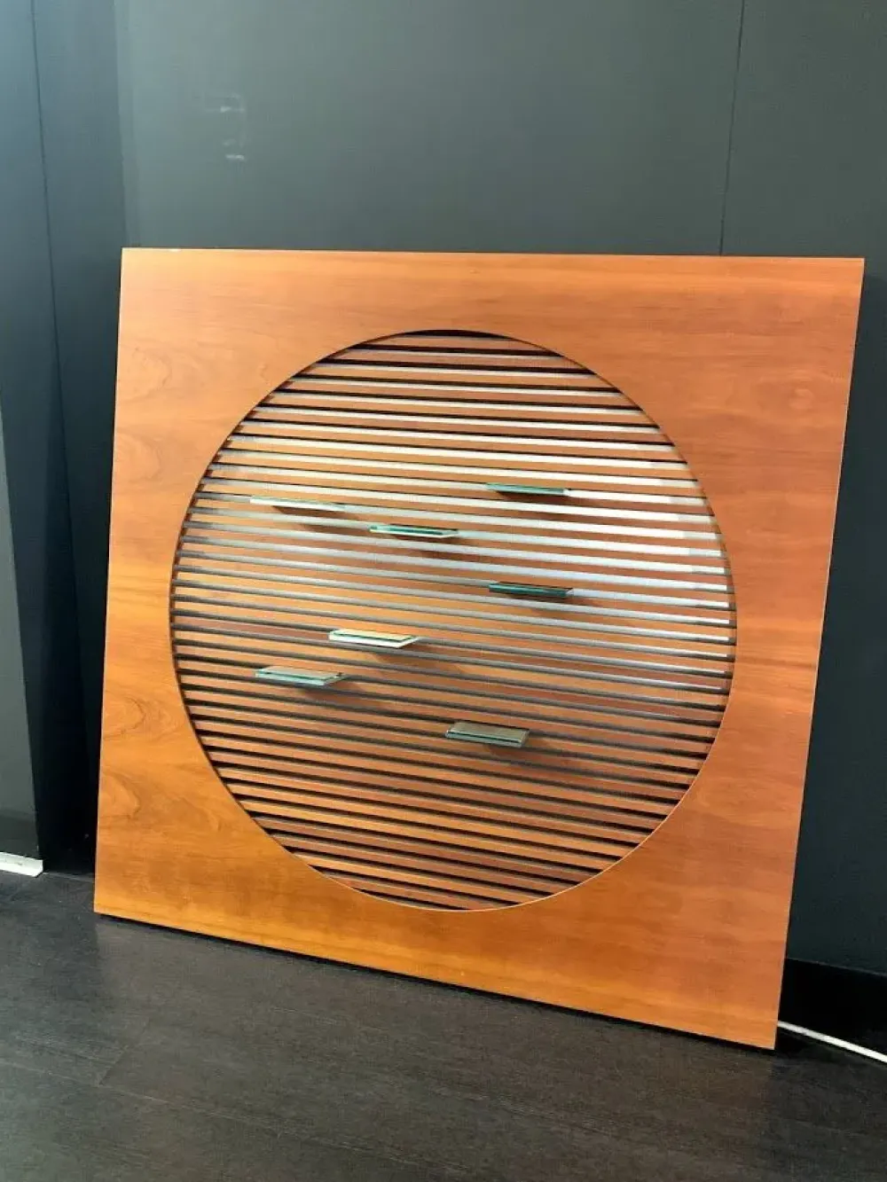 Porta cd/dvd in ciliegio chiaro, da muro si presenta come un pannello di alto spessore nel quale è inscritto un cerchio fessurato longitudinalmente al