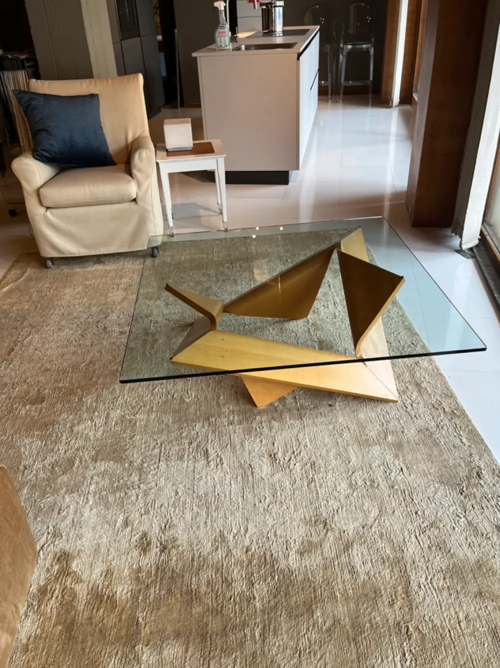 Tavolino da salotto cm 105 x 105 in legno curvato impiallacciato noce biondo , con piano in vetro temperato