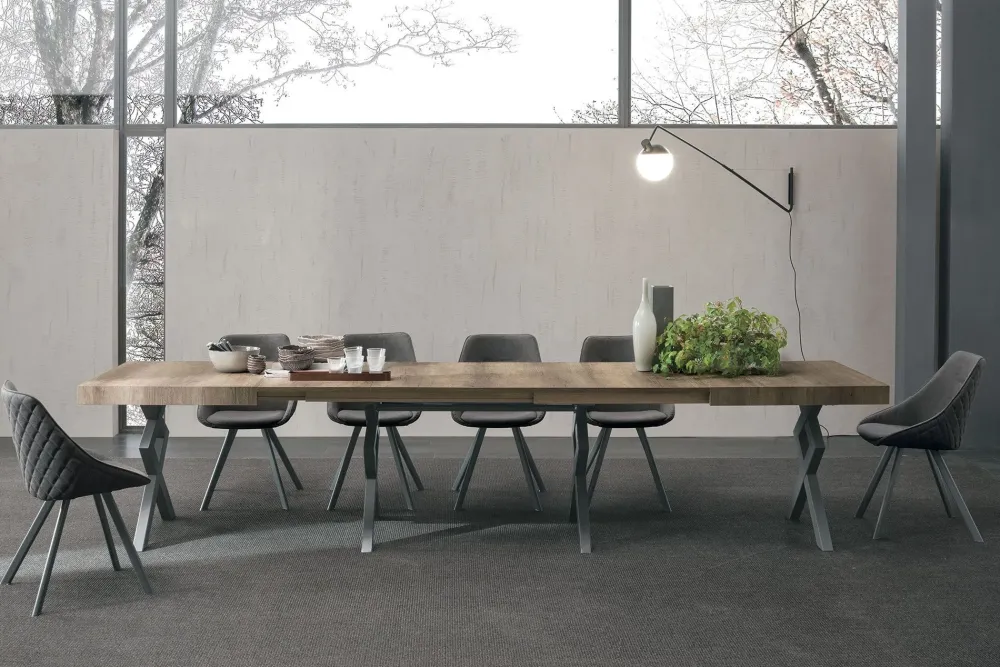 Tavolo super allungabile con struttura in metallo verniciato.