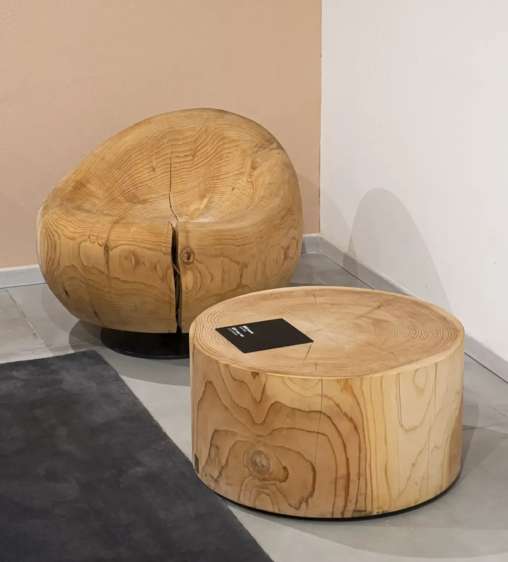 Poltrona in legno massello di cedro profumato lavorata da un blocco unico. Si tratta di un monolite scultoreo dal design curvilineo e sinuoso caratterizzato da una seduta ergonomica in linea di continuità con lo schienale. Versione con basamento in ferro girevole. Dimensioni L 75 x P 75 x H 40/57 cm.