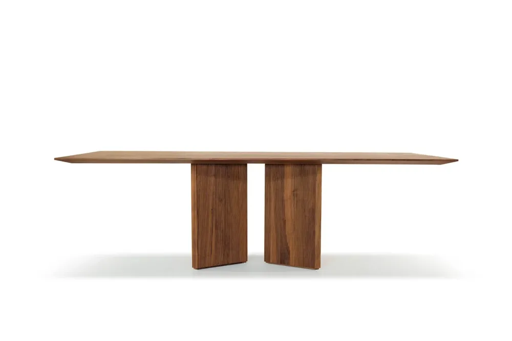 Tavolo disegnato dallo studio Cappelletti, con top realizzato interamente in legno massello a liste incollate con spessore assottigliato. La base è costituita da gambe a forma di prisma, ciascuna caratterizzata da tre vertici in legno massello con lavorazione Fresart, che crea un effetto geometrico moderno e dinamico. Dimensioni L 240 x P 100 x H 75 cm