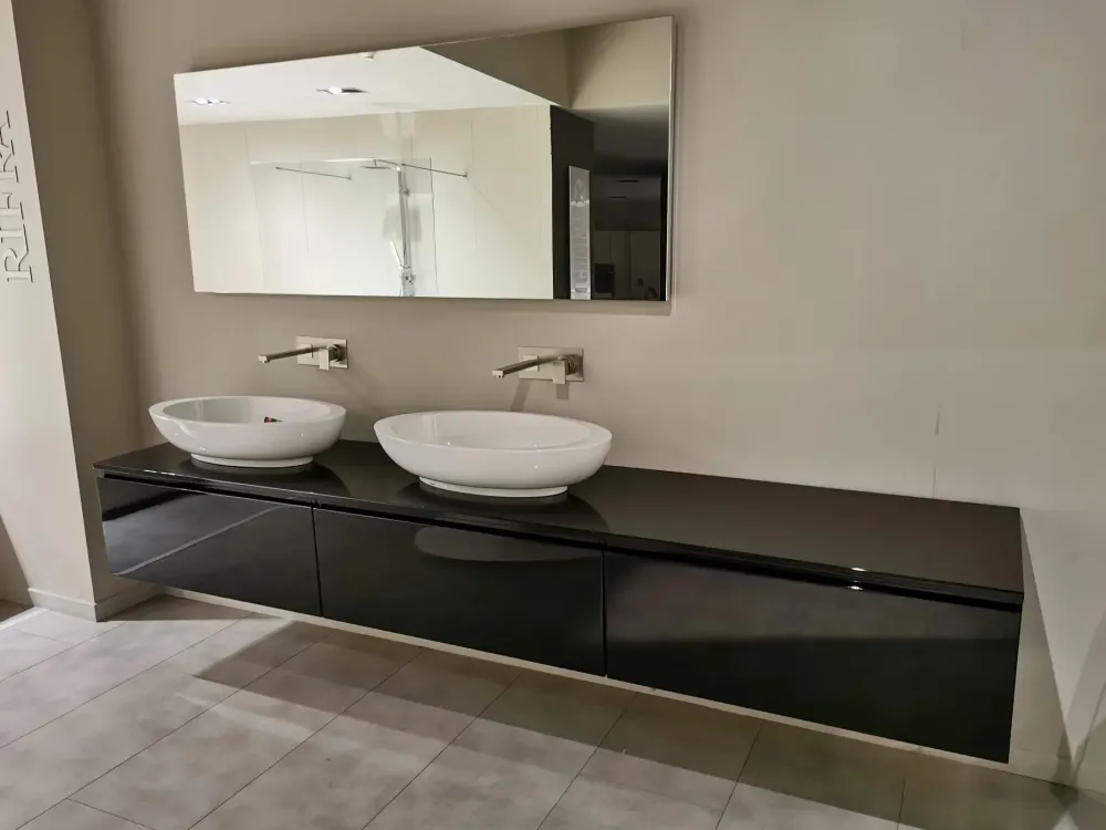 BK2 mobile bagno sospeso laccato lucido nero, design by Castiglia Associati, dim. l. 270 p. 55 h. 40, completo di specchio retroilluminato l. 180 h. 74 e doppi lavabi serie Nest in pietraluce white dim. l. 75, rubinetteria Gessi, monocomando con bocca a parete, finitura acciaio spazzolato, dim. l. 22 p. 19,9.