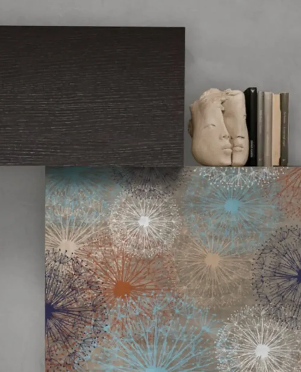 Finiture della composizione: Materico rovere carbone, Grafica 9003, Metallo antracite 160, Laccato opaco tabasco 171.