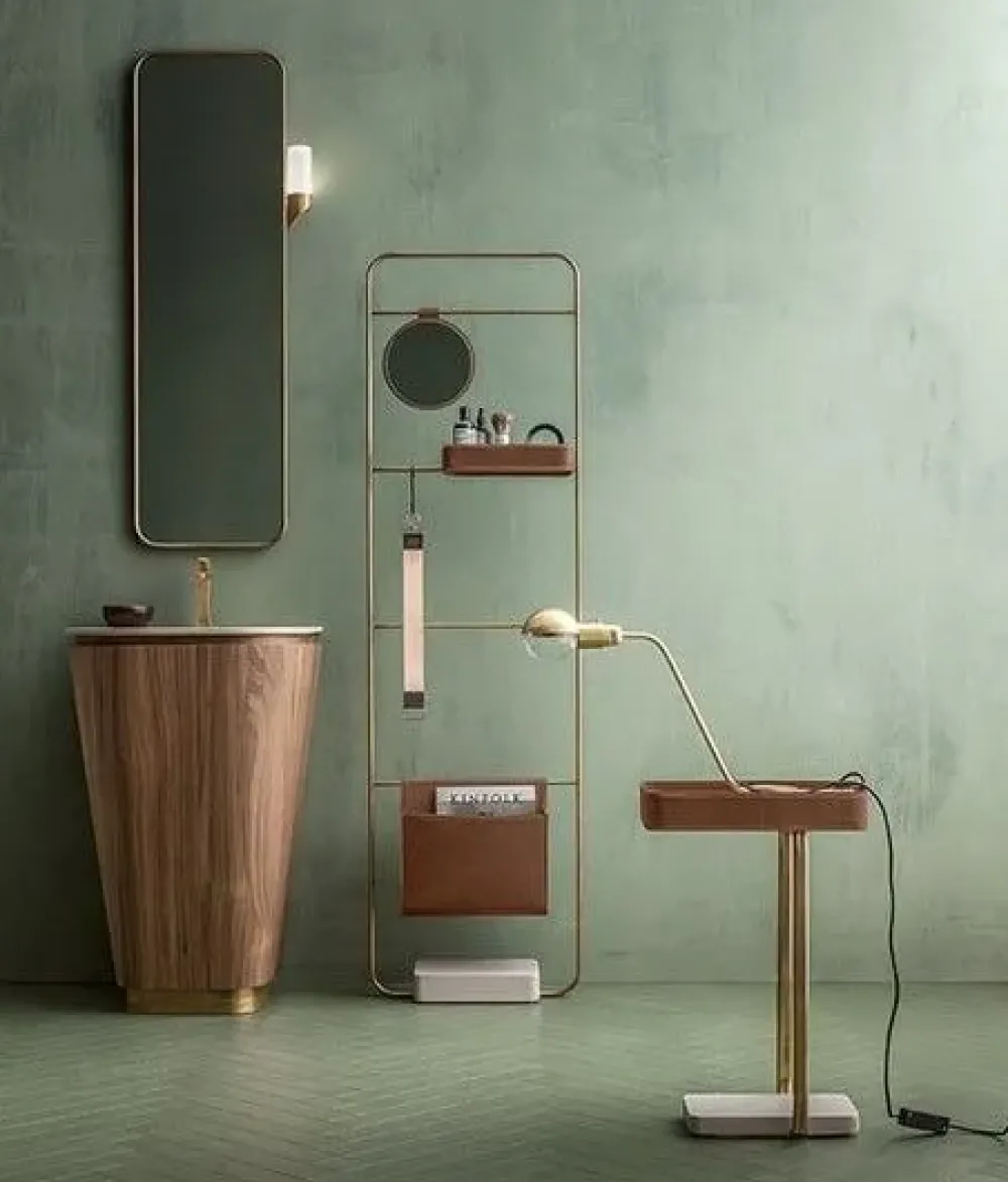 Completo di specchio, lampada e accessori in metallo bronzato e Servetto autoportante con base in Ecomalta.