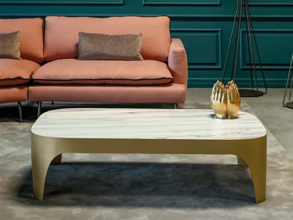 Tavolino in acciaio sagomato verniciato e top in gres porcellanato.