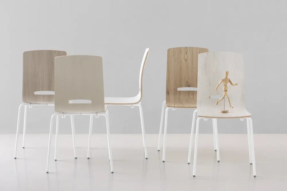 Seduta impilabile dalle curve delicate ed essenziali, con scocca in legno multistrato nobilitato melamminico effetto legno o monocolore, da abbinare ai piani o alle gambe dei tavoli.