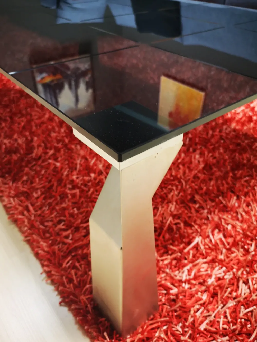 Tavolino rettangolare con piano in vetro inciso fumè nero.