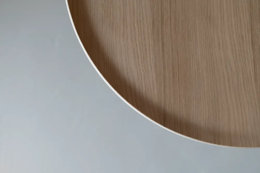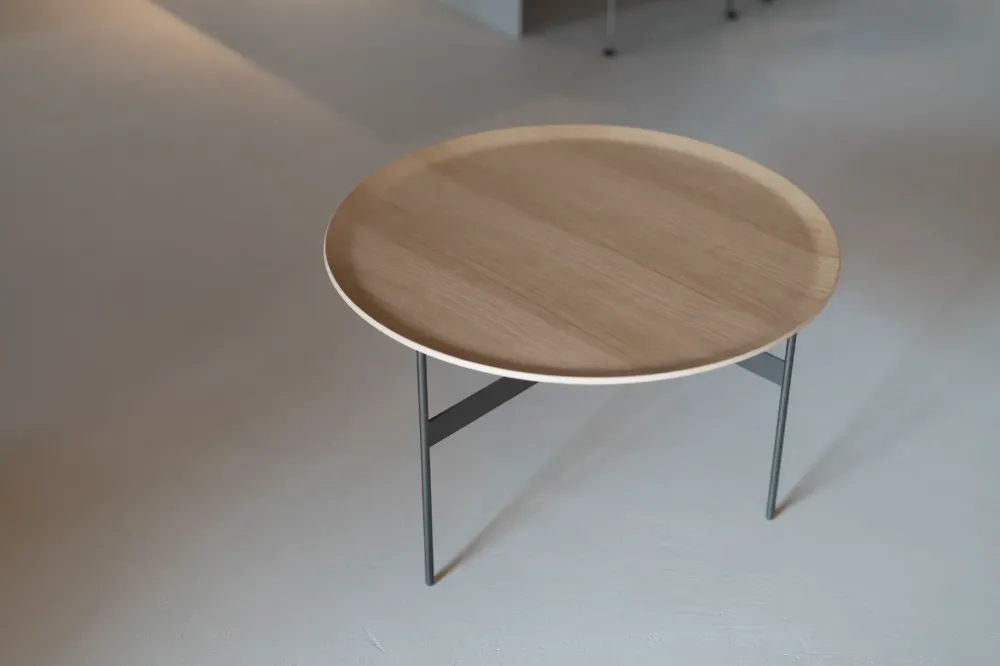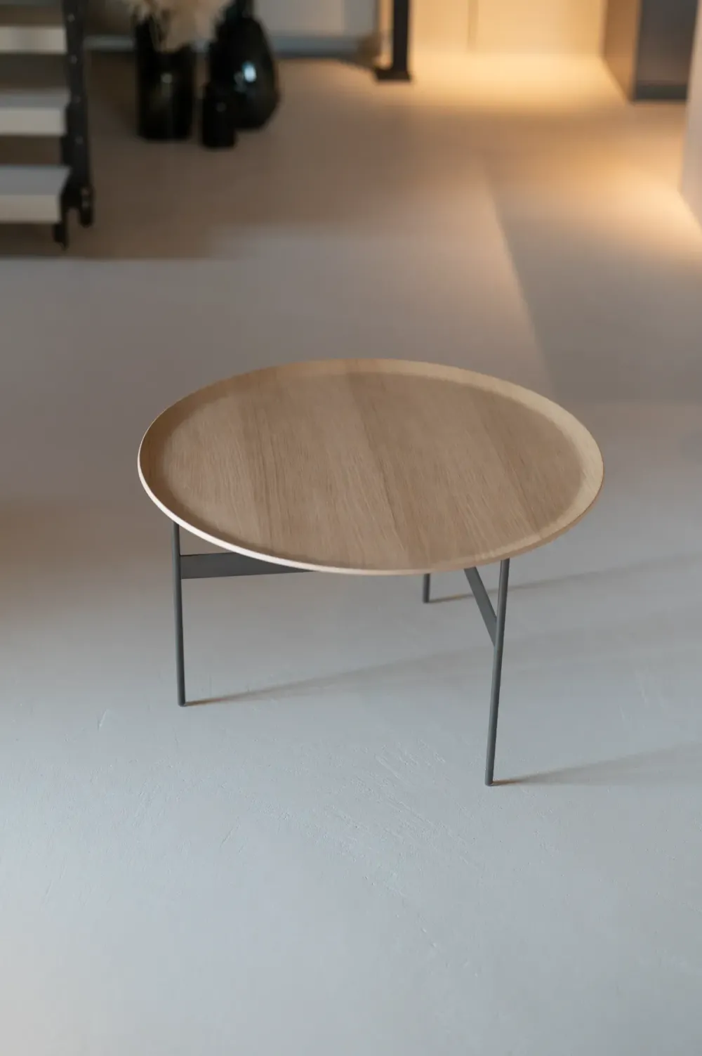Tavolino mod.Formiche diam.67xH.43cm struttura fin.peltro piano legno fin.rovere chiaro.