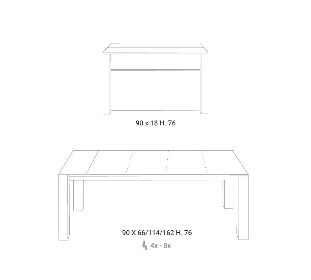 Slimmy tavolo consolle allungabile, molto stretta con binari in alluminio. La consolle chiusa ha una profondità di solo 18 cm che sta da per tutto. Le 3 allunghe in eco legno spessore 1,9 cm, sono alloggiate nella struttura,