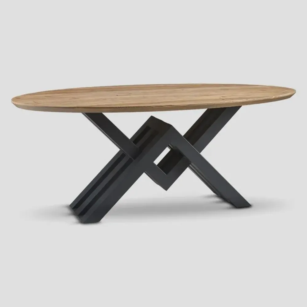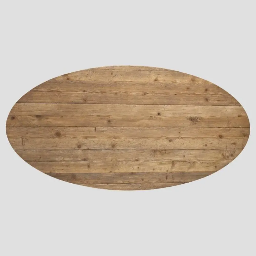 Tavolo ovale in legno vecchio, base in metallo finitura brunita, top in finitura Naturale. Dimensioni:78 x 200 x 100 cm