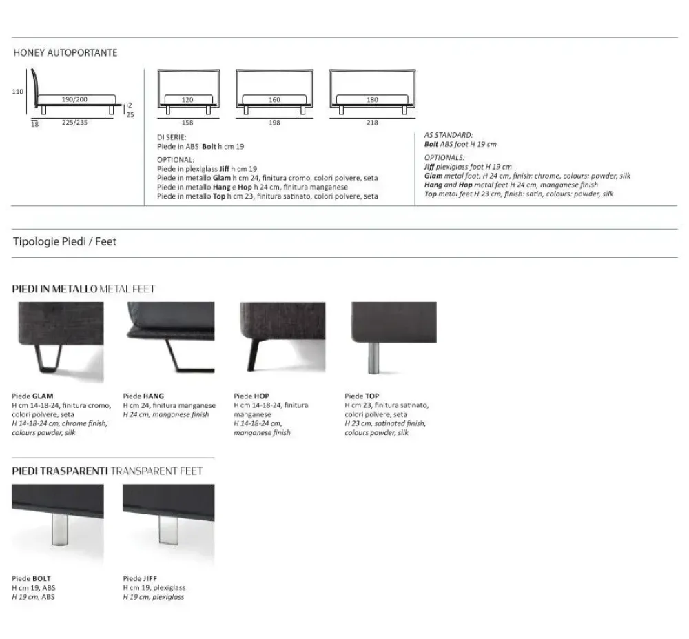Il letto è disponibile per materassi di dimensioni in larghezza: cm 120-160-180.