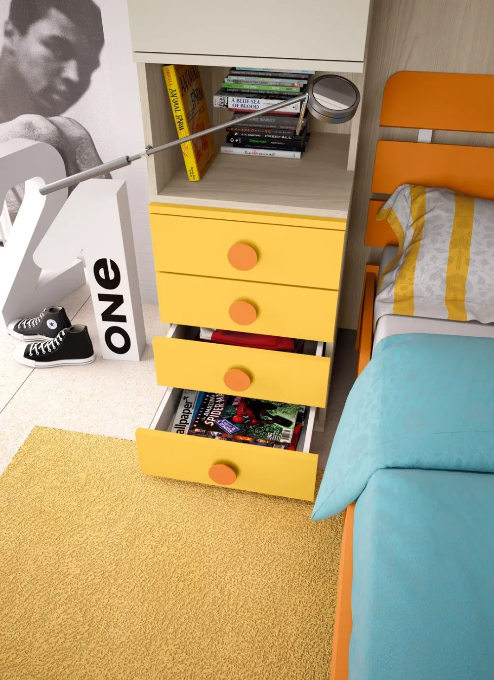 Per creare le atmosfere ideali per il regno dei giovani, opta per camerette dalle tonalità più accese e dalle forme morbide, affinchè l’ambiente possa trasmettere energia e positività; il brand ha selezionato un materiale tanto pregiato quanto resistente per questa cameretta Cameretta a ponte 12, ovvero il laminato opaco, così da completare la resa estetica della stanza completandone anche le qualità pratiche.