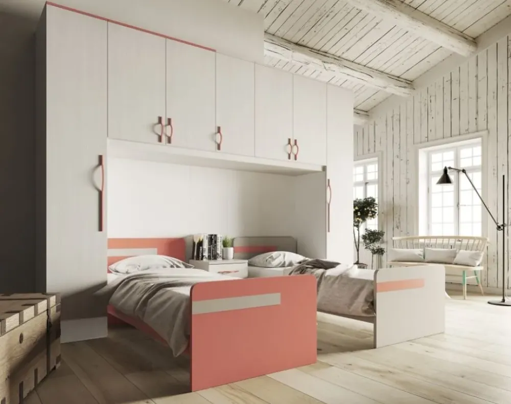 Cameretta nuova Mottes mobili, due letti con rete compresa, comodino movibile con tre cassetti, armadiatura a ponte con sette ente battenti, compreso di mensole e bastoni appendiabiti. Geometrie, linearità e pulizia formale per arredare e rendere funzionale un’intera parete. Come in foto i colori predominanti sono il natural wood, visone, sabbia , bianco e rosso, ma, senza variazione di prezzo si possono scegliere a proprio piacimento, alleghiamo foto con tutti i colori disponibili. Le misure sono: parete frontale 290 cm. Il prezzo è di 1900 euro, iva e consegna compresi. I tempi di consegna sono di circa 20//30 giorni lavorativi, consegna anche in Europa servizio a richiesta Per qualsiasi informazione, preventivo o montaggio potete contattarci.