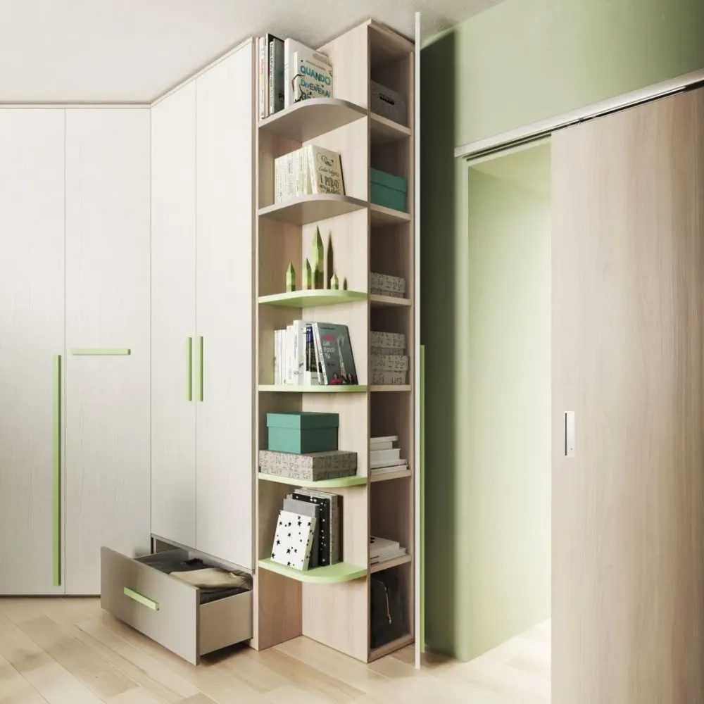 Con il letto a castello Luna, la cabina armadio ad angolo e una serie di elementi modulari, la composizione 23 trasforma anche le stanze più piccole in un vero e proprio micro-mondo organizzato, ideale per fratelli, sorelle o amici che condividono la stanza.
