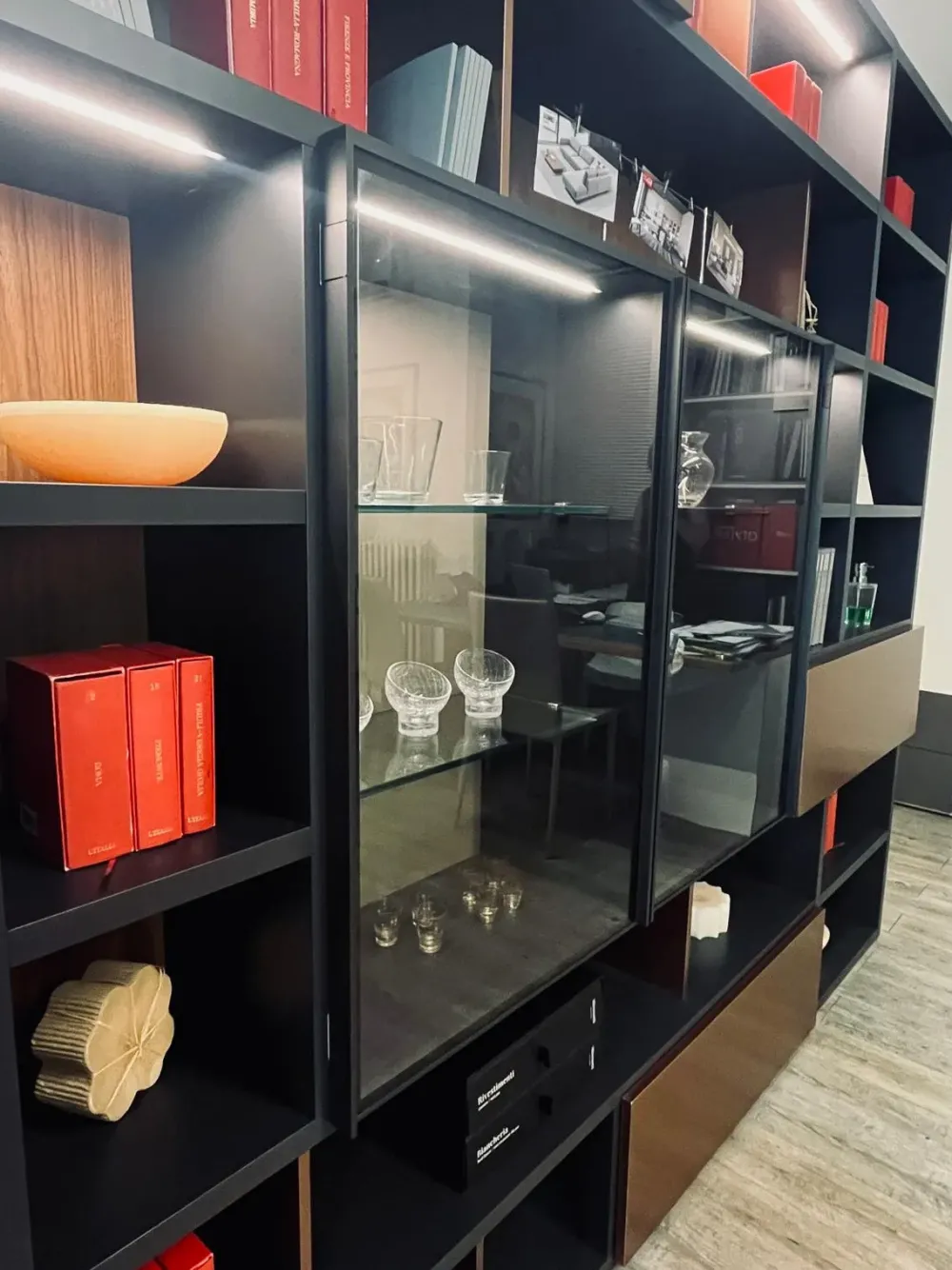 libreria, struttura attrezzata con contenitori e vetrinette: tutto in una composizione ricca di fascino e funzionalità.