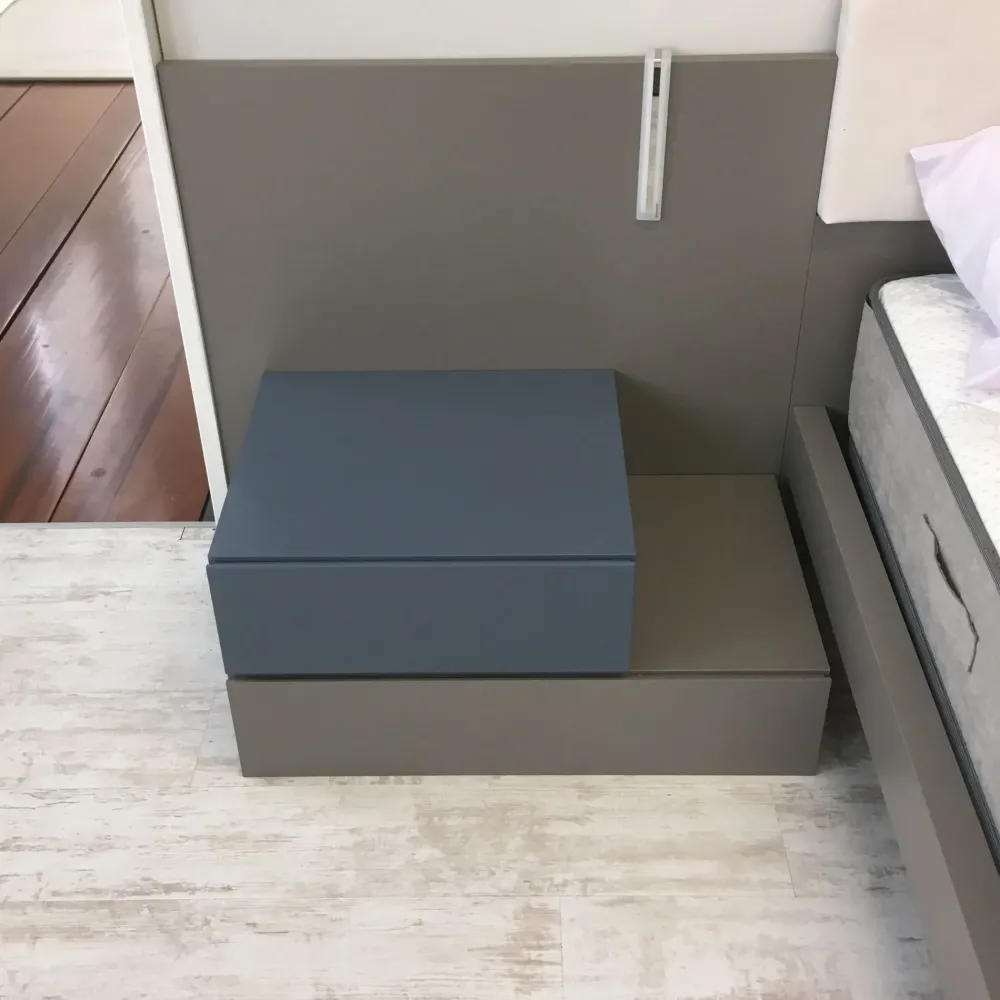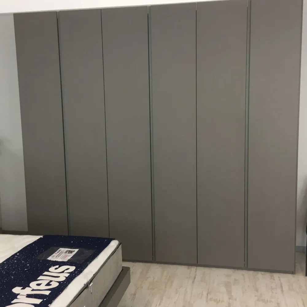 Nella proposta sono compresi anche i due comodini realizzati nella stessa tinta-finitura della testiera, come anche il comò delle dimensioni indicative di L 110 x H 792 x P 48,8 cm, oltre all’armadio da L 275 x H 253 x P 60,2 cm con apertura battente senza maniglia ma con gola metal.