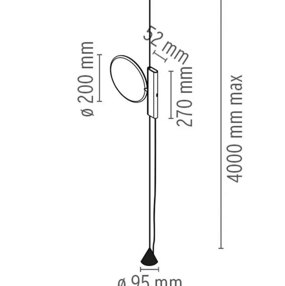 Apparecchio di illuminazione a luce diretta. Testa in alluminio pressofuso verniciato lucido o cromato. Corpo in PA66+30%FV stampato ad iniezione con cover in alluminio estruso verniciato lucido o cromato. Testa orientabile. Il movimento verticale del corpo illuminante รจ ottenuto mediante lo scorrimento della struttura interna del corpo su un cavetto di acciaio teso tra il plafone e il pavimento (lunghezza utile 4000mm). Interruttore dimmerabile con tecnologia Soft Touch. Alimentatore su spina con plug intercambiabili.