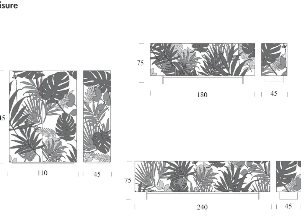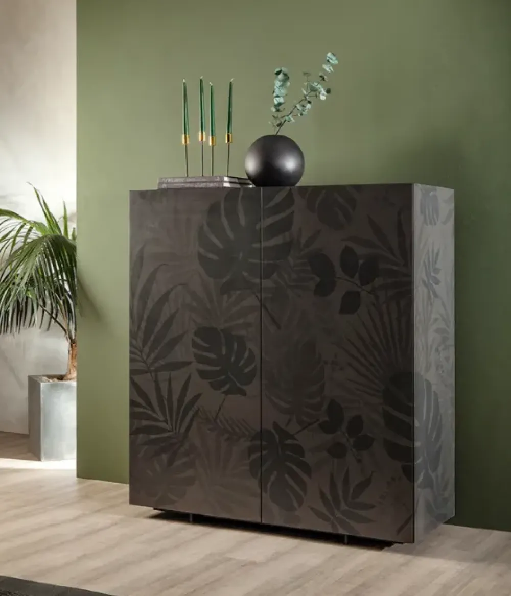 Foglie ampie, un modello unico di madia a tre o quattro ante, o ancora un box contenitore alto e raffinato. Una serigrafia floreale unica, creata ad arte per definire, ampliare e decorare il vostro living, con una colorazione dai toni unici, che mette in rilievo ad un tempo le pareti e i dettagli del prodotto.
