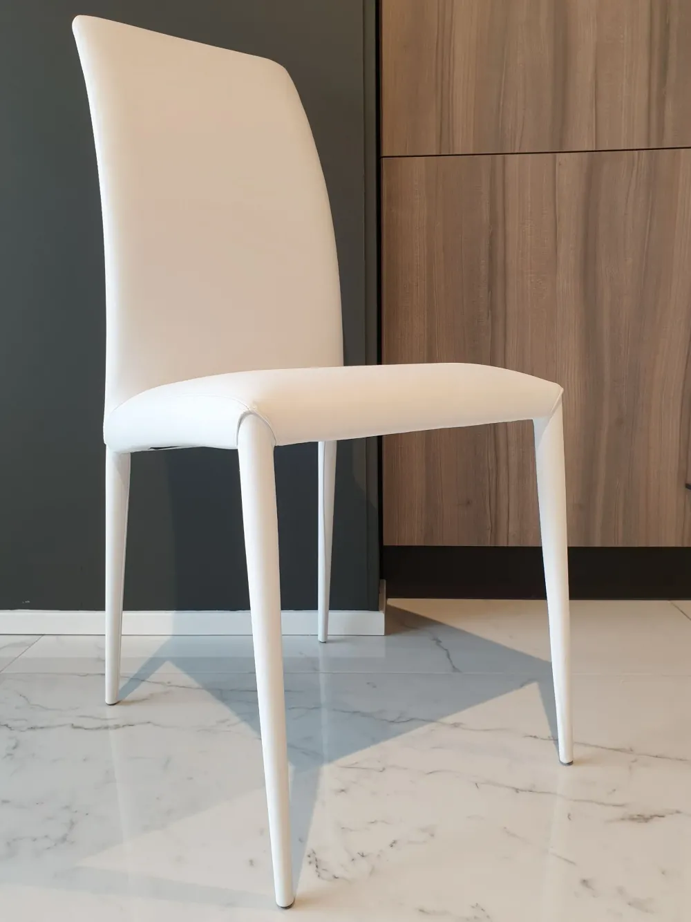 Sedie completamente rivestite in ecopelle bianca con schienale alto e leggermente arrotondato, per conferire importanza ed eleganza alla struttura. Disponibili 4 pezzi vendibili in blocco, non vendibili separatamente. Disponibili per la visione presso il nostro punto vendita di Cernusco Lombardone (LC).