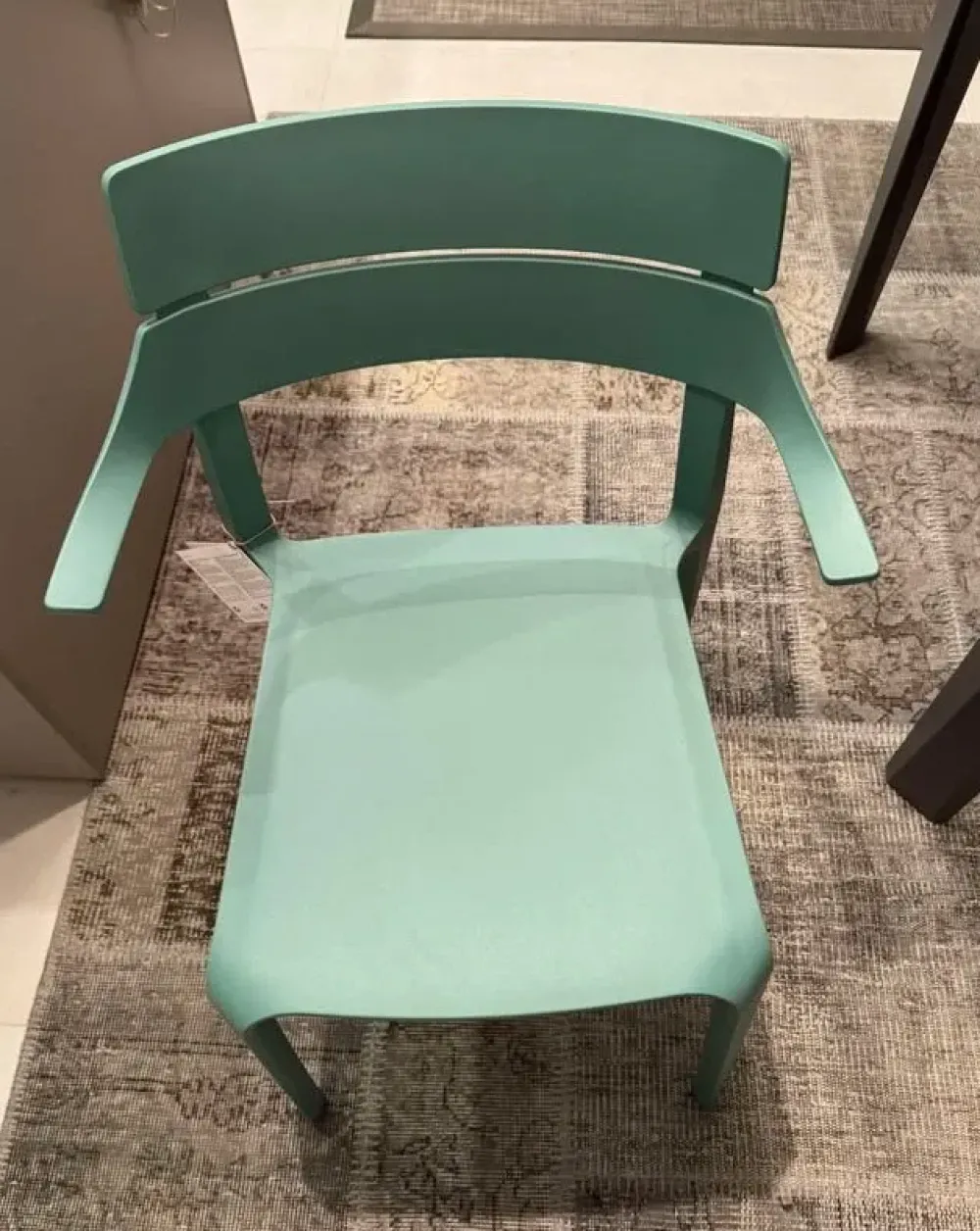 Sedia con braccioli corti impilabile con struttura integrale in polipropilene e fibra di vetro riciclato e riciclabile. Finitura verde. Come da foto.