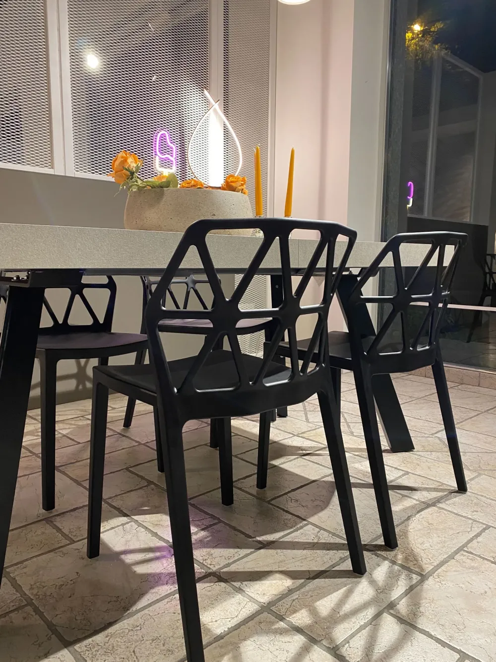 Modello sedia Alchemia di Connubia, in finitura nero opaco. E’ completamente realizzata in polipropilene, con tecnologia airmoulding. Presenta una superficie opaca foto-incisa, adatta anche per l uso esterno. Sedia impilabile per 6. In negozio ne sono presenti quattro. Il prezzo è cad.01