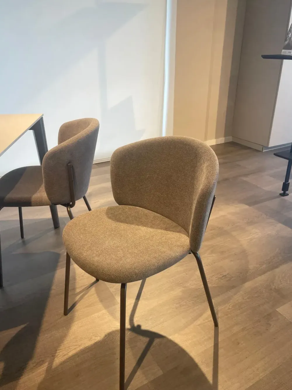 La sedia Desy Mid è una compatta soluzione di design per la zona giorno, in morbido tessuto color tortora