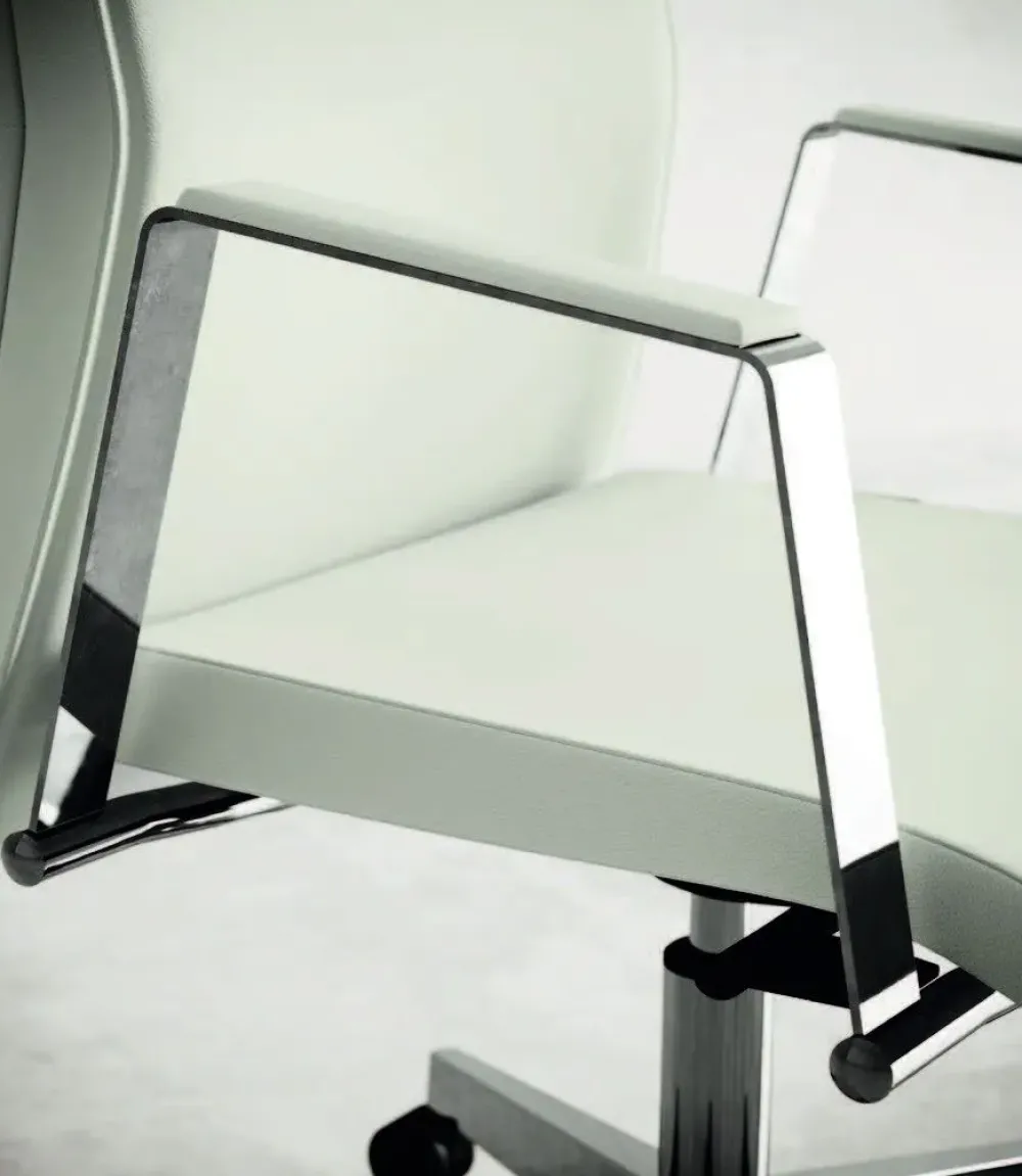 Bracciolo fisso cromato sagomato con pad tappezzato in tinta con la poltrona.