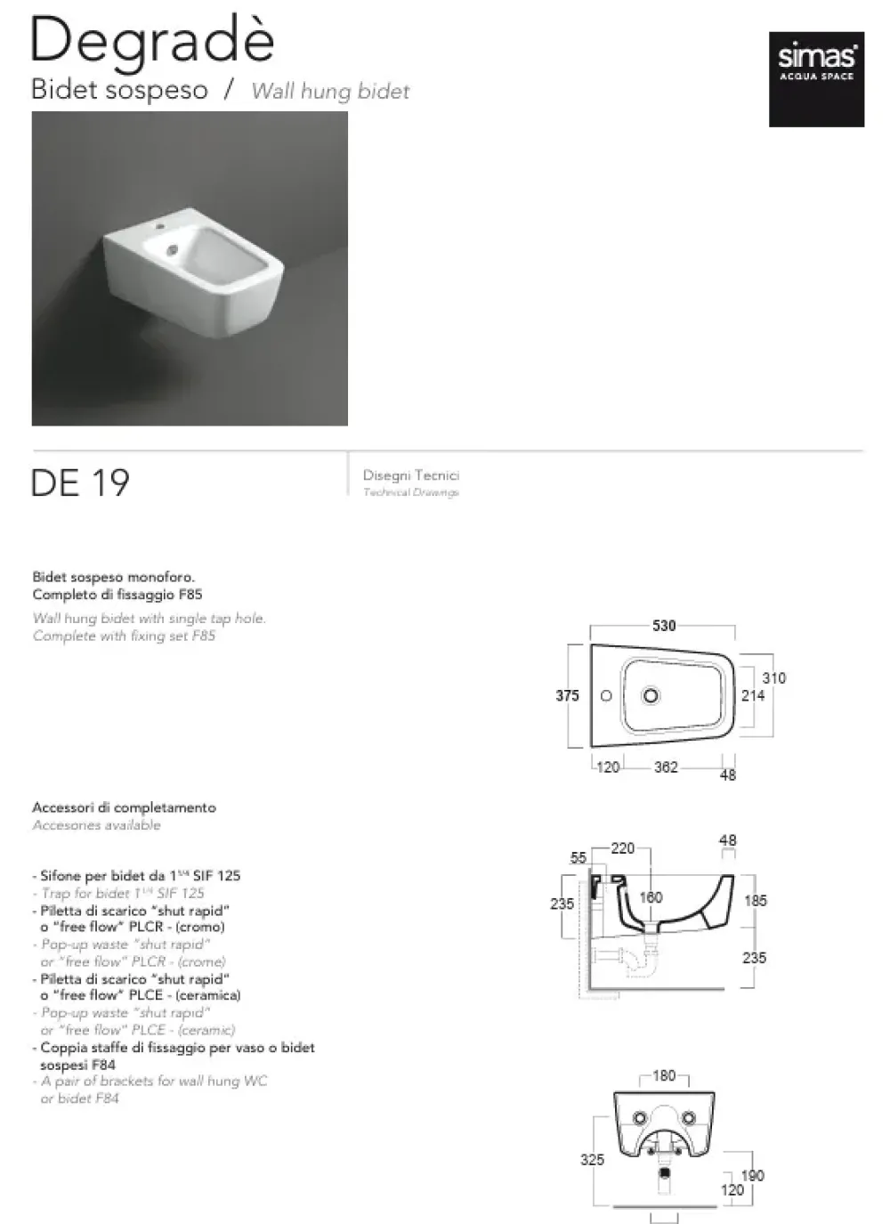 Disponibili n. 1 Wc e n. 1 bidet sospesi modello Degrade di Simas nella finitura antracite matt.
