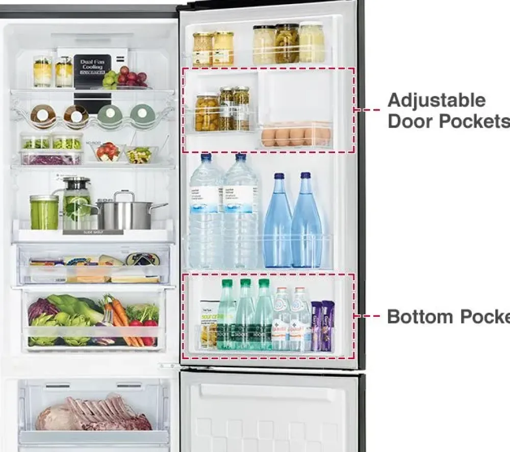 La disposizione dei balconcini sulla porta è regolabile per contenere tutto il necessario; il comodo balconcino basso invece è di misura ridotta per le bottiglie da mezzo litro. Possiede anche un ripiano dalla struttura ondulata, che permette di riporre i migliori vini e le bottiglie da un litro e mezzo con un inclinazione ideale.
