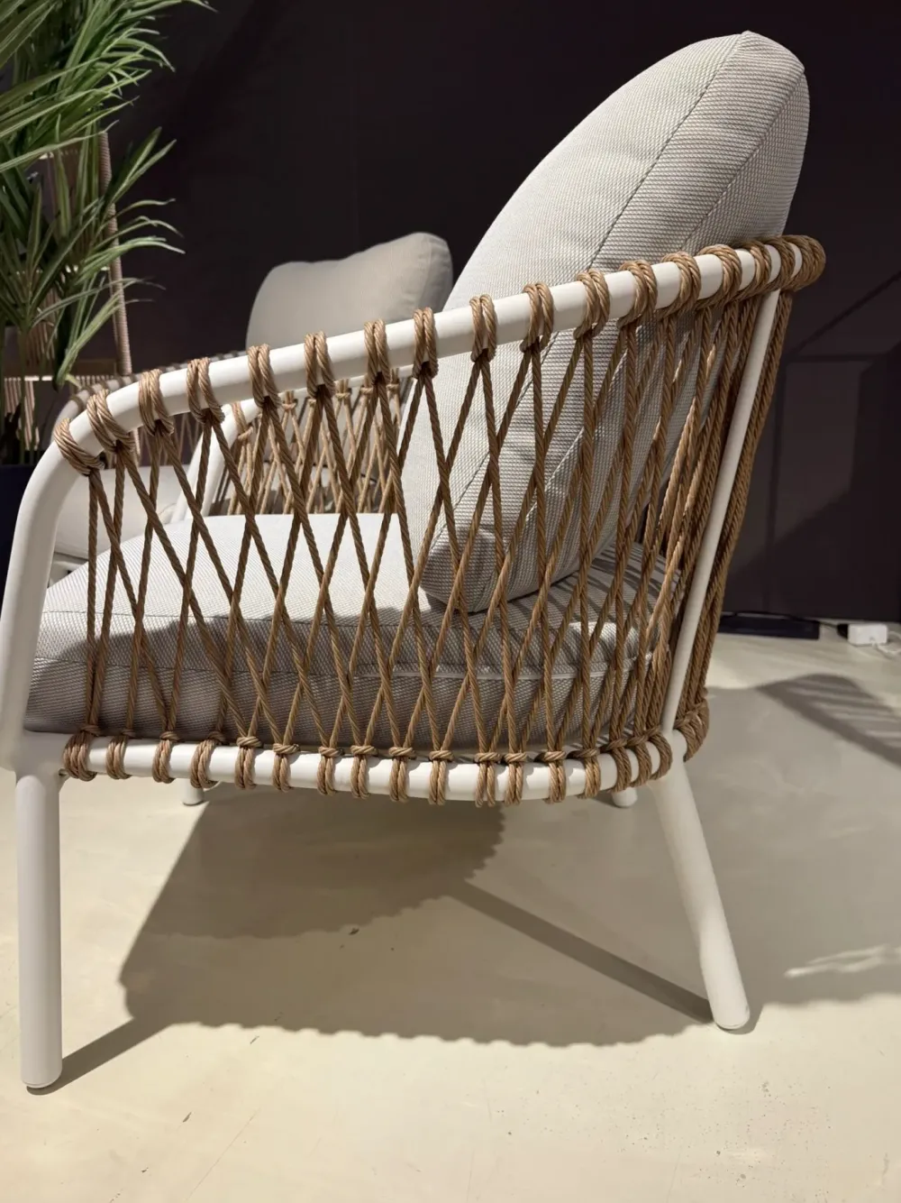 L’elegante finitura bianca si integra perfettamente con qualsiasi ambiente esterno, offrendo una sensazione di freschezza e luminosità. Il divano a due posti e le poltrone sono progettati per garantire il massimo relax, mentre il tavolino rotondo completa l’insieme con la sua praticità e stile.