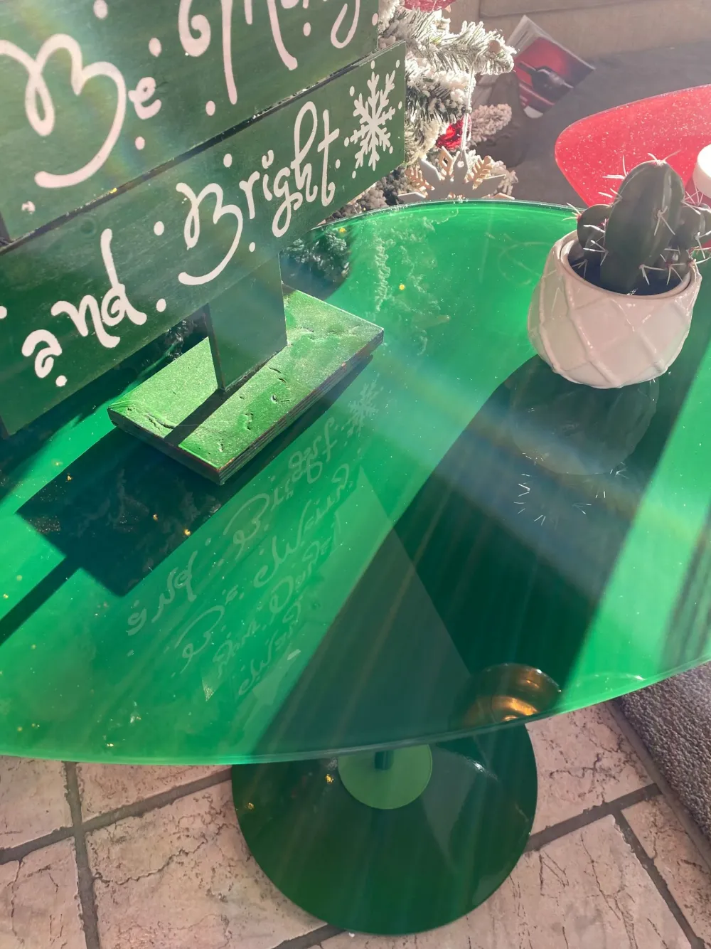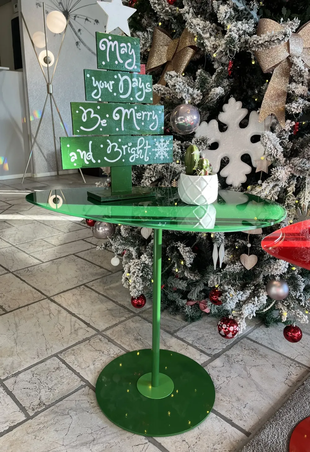 Tavolino modello Coffee table CRYSTAL di Maconi. Piano a forma di goccia in vetro verniciato verde dimensione lato stretto 40 cm mentre lato lungo 60 cm, struttura in metallo verniciato verde (h 52 cm), basamento verniciato verde.