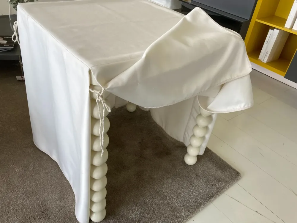 Tavolino rivestito in tessuto sfoderabile,con struttura laccato opaco colore avorio.