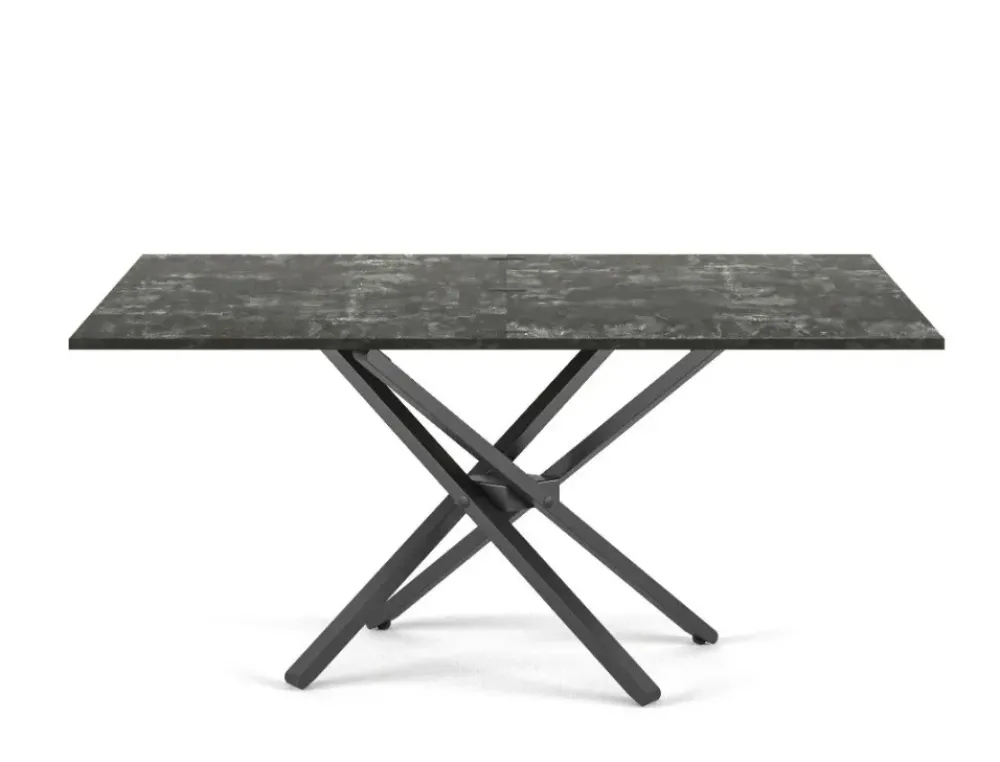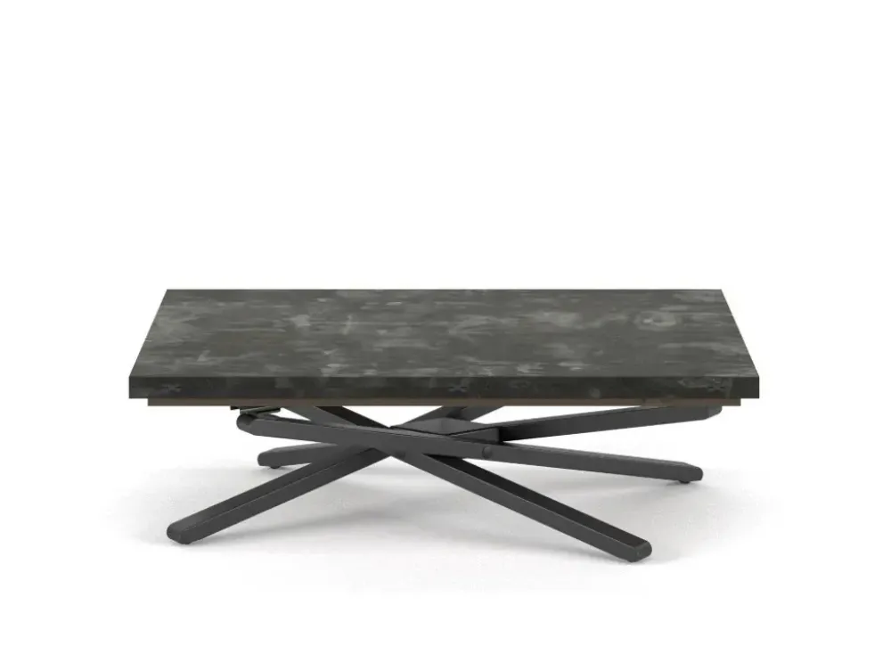 Linee decise e giochi di intrecci si fondono nella struttura scultorea di questo tavolino trasformabile. Un classico coffee table che con pochi e semplici movimenti, si trasforma in un accogliente tavolo da pranzo. Le finiture del piano in eco-legno e la robustezza del basamento metallico gli conferiscono carattere e funzionalita senza pari, il sistema di sollevamento e brevettato.