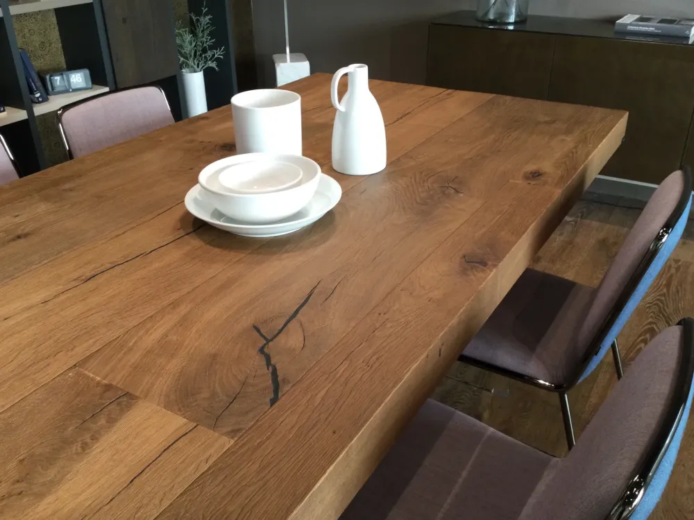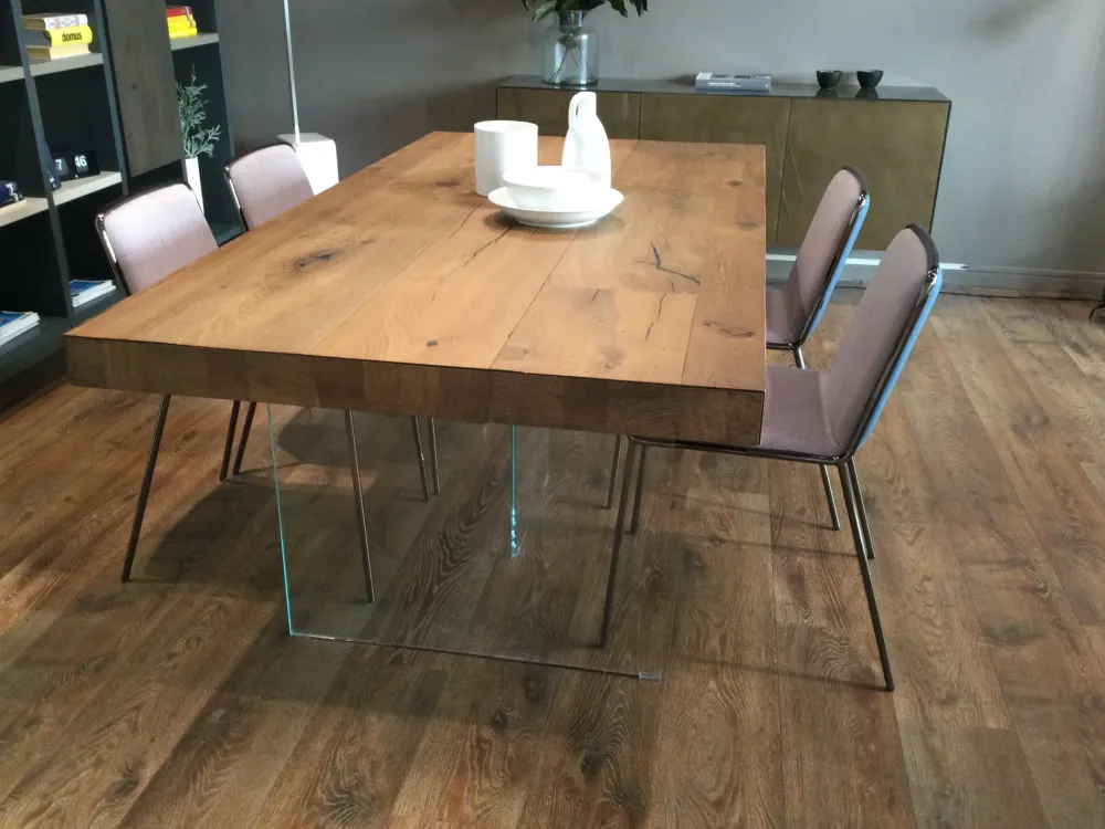 Tavolo rettangolare allungabile in massello di rovere naturale con basamento in cristallo trasparente extrachiaro L.190×100 allungabile a 294