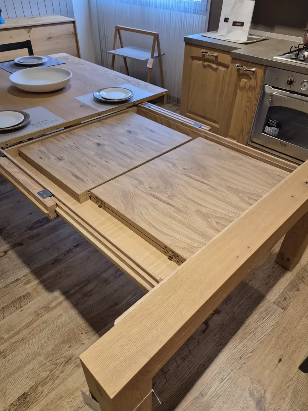 Tavolo quadrato allungabile in rovere.